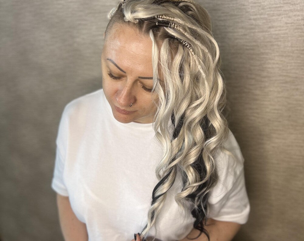 Arctic Mocha: mix of brown, blonde, and turquoise BRUSHABLE synthetic DE dreaded curls (regular, braided middle or push-up)