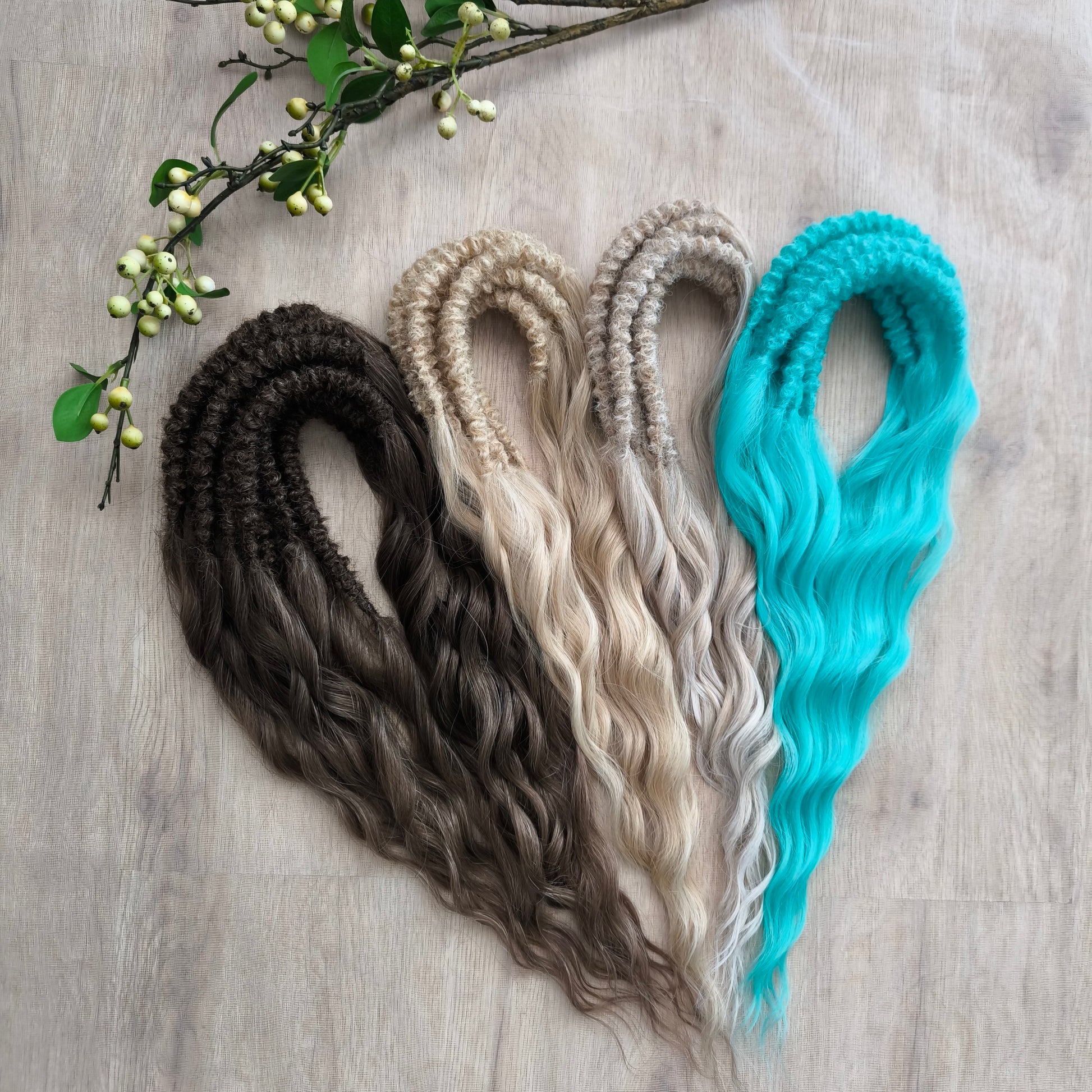 Brown, 2 shades of blonde, and turquoise green soft, lightweight, and reusable synthetic brushable double-ended wavy dreadlocks (regular dreaded, braided middle or push-up).
