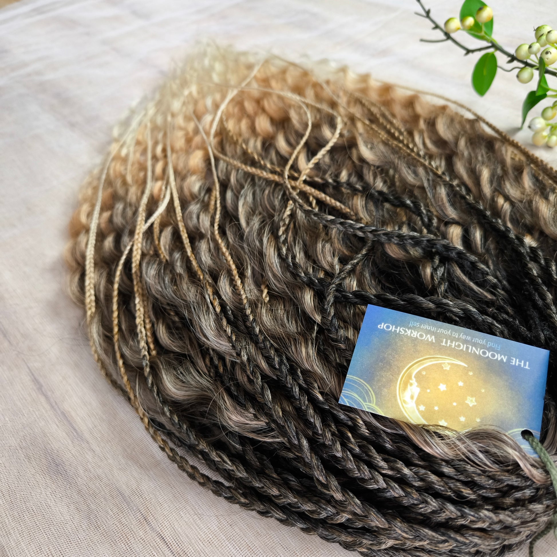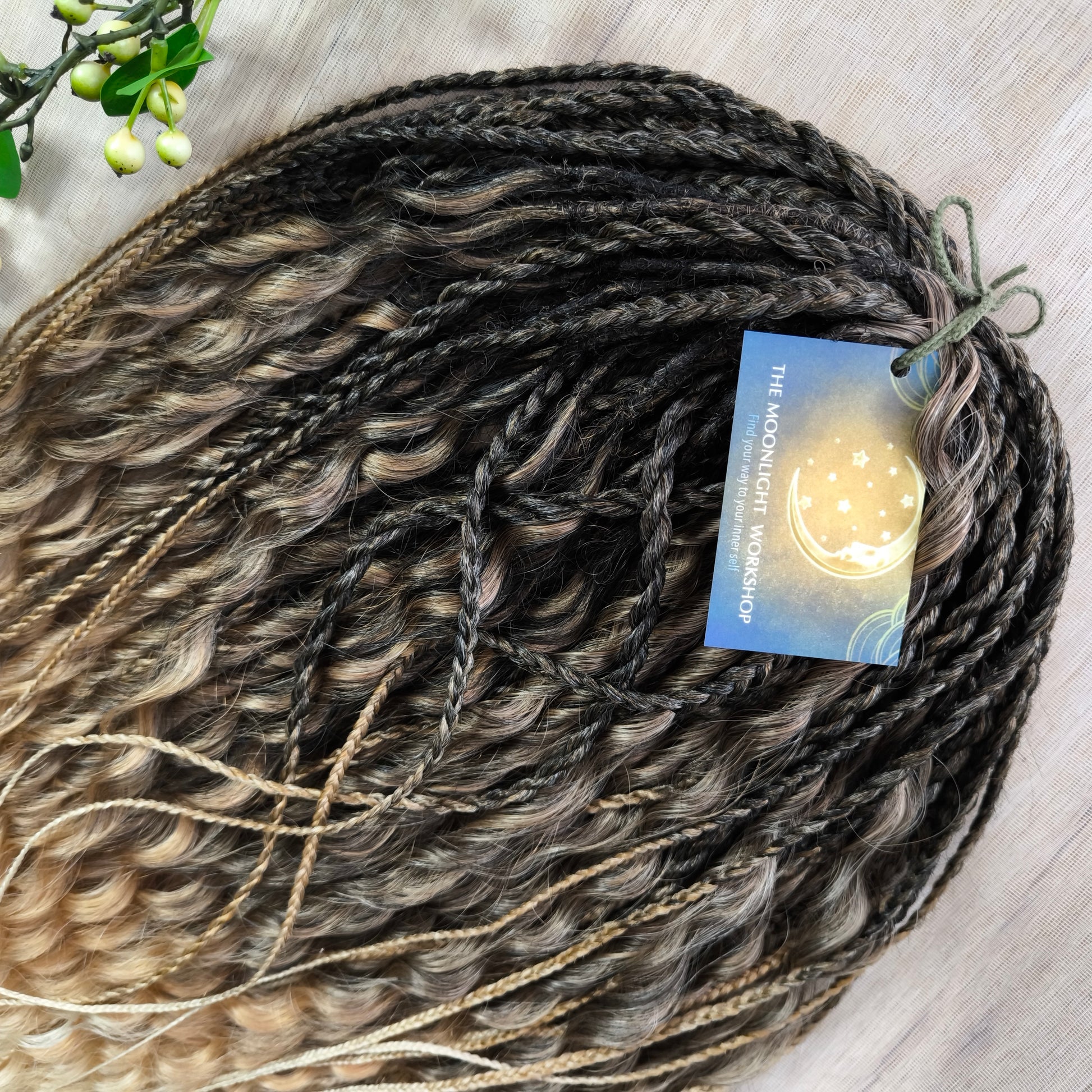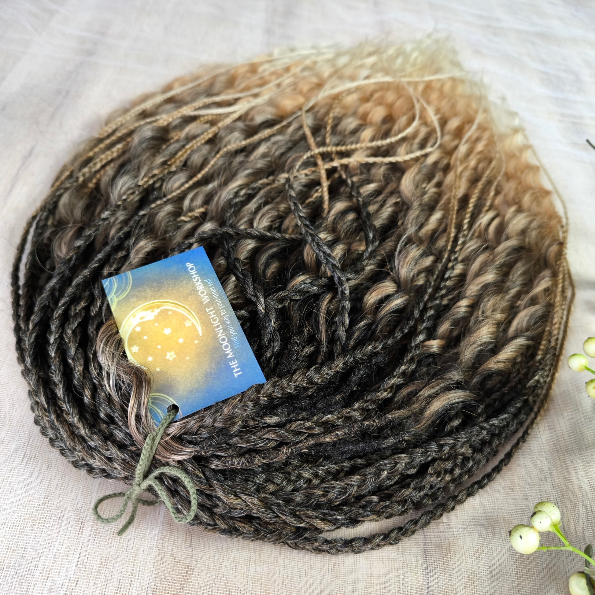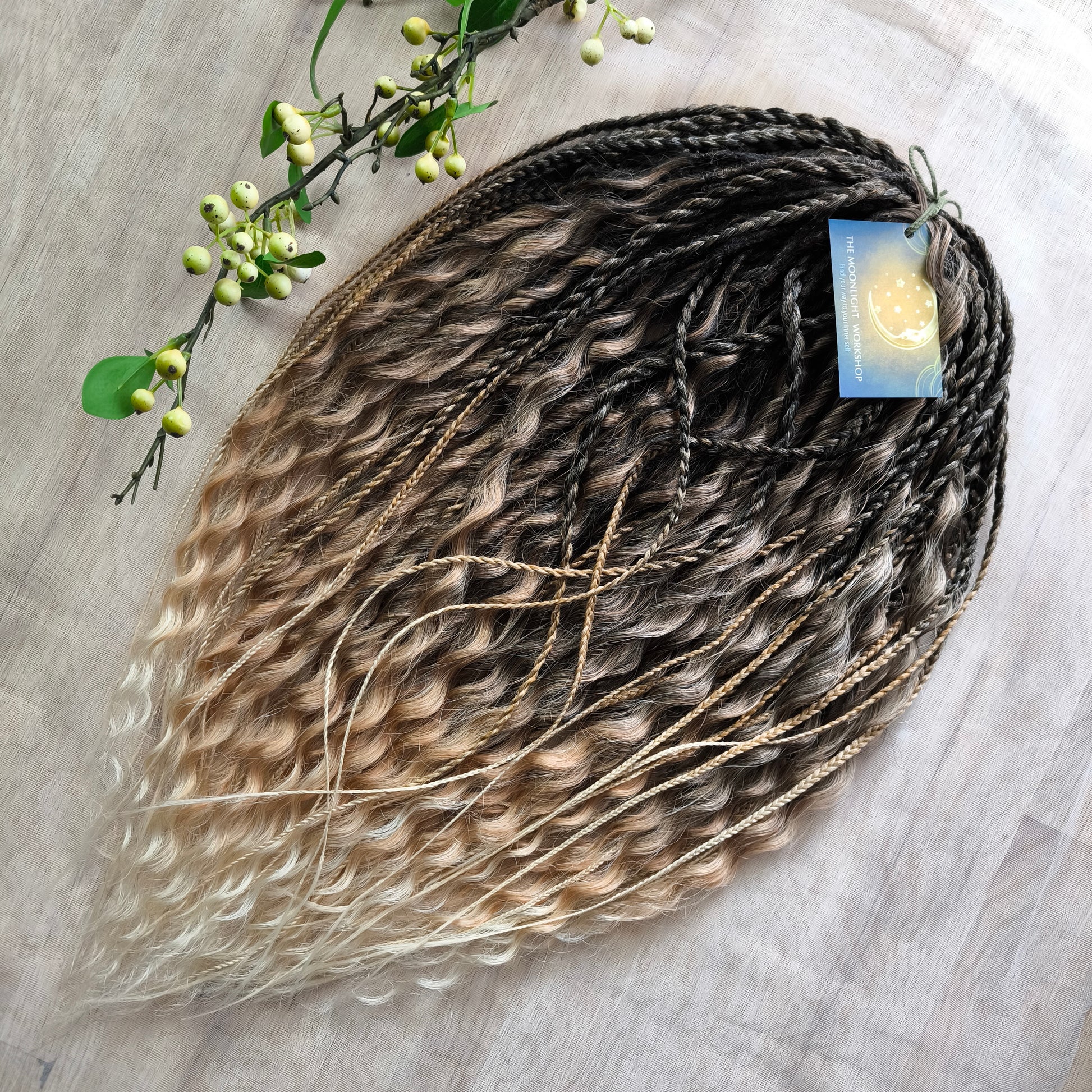 Hybrid double ended synthetic set of braids, Senegalese twists and dreaded curls ombre from brown to wheat and honey blonde