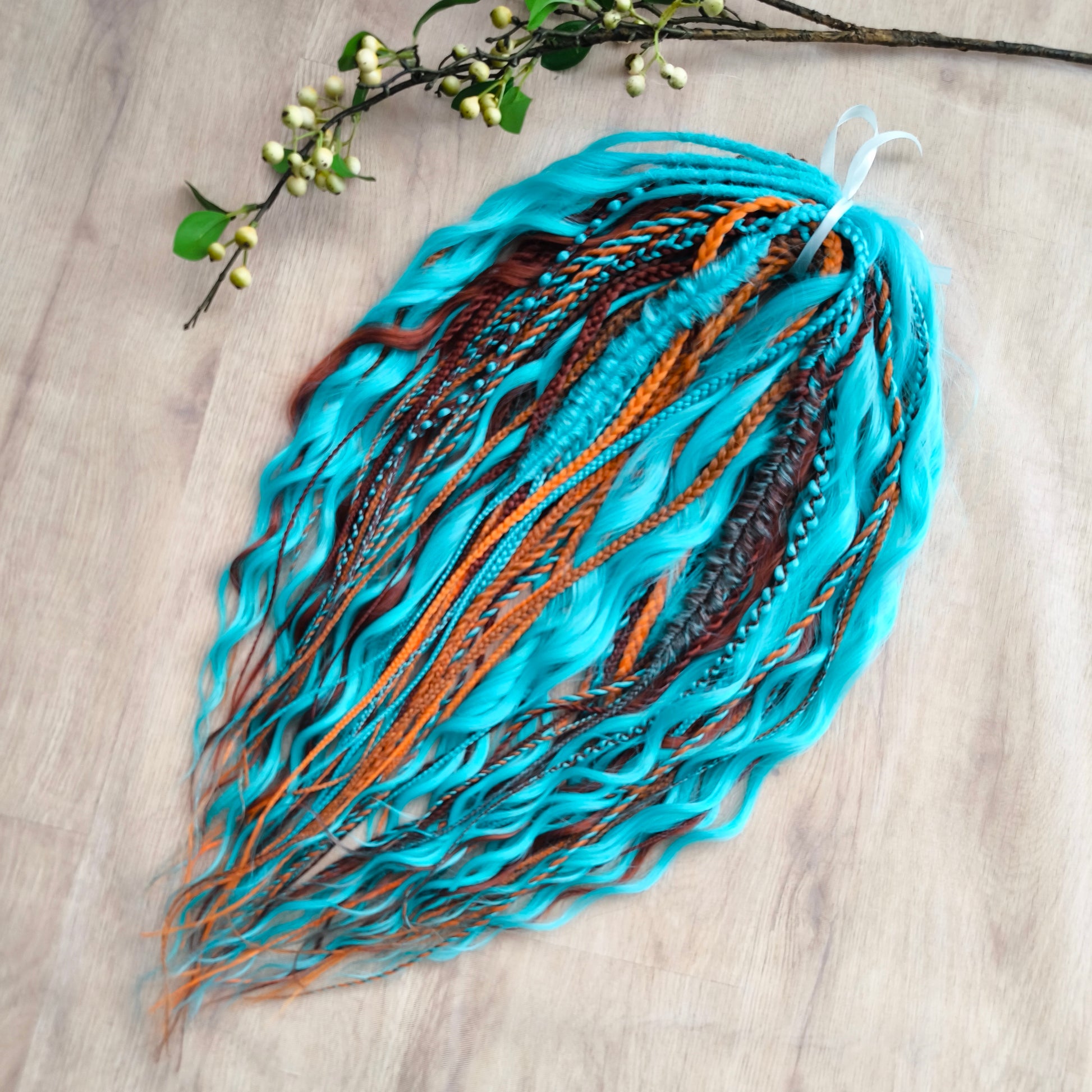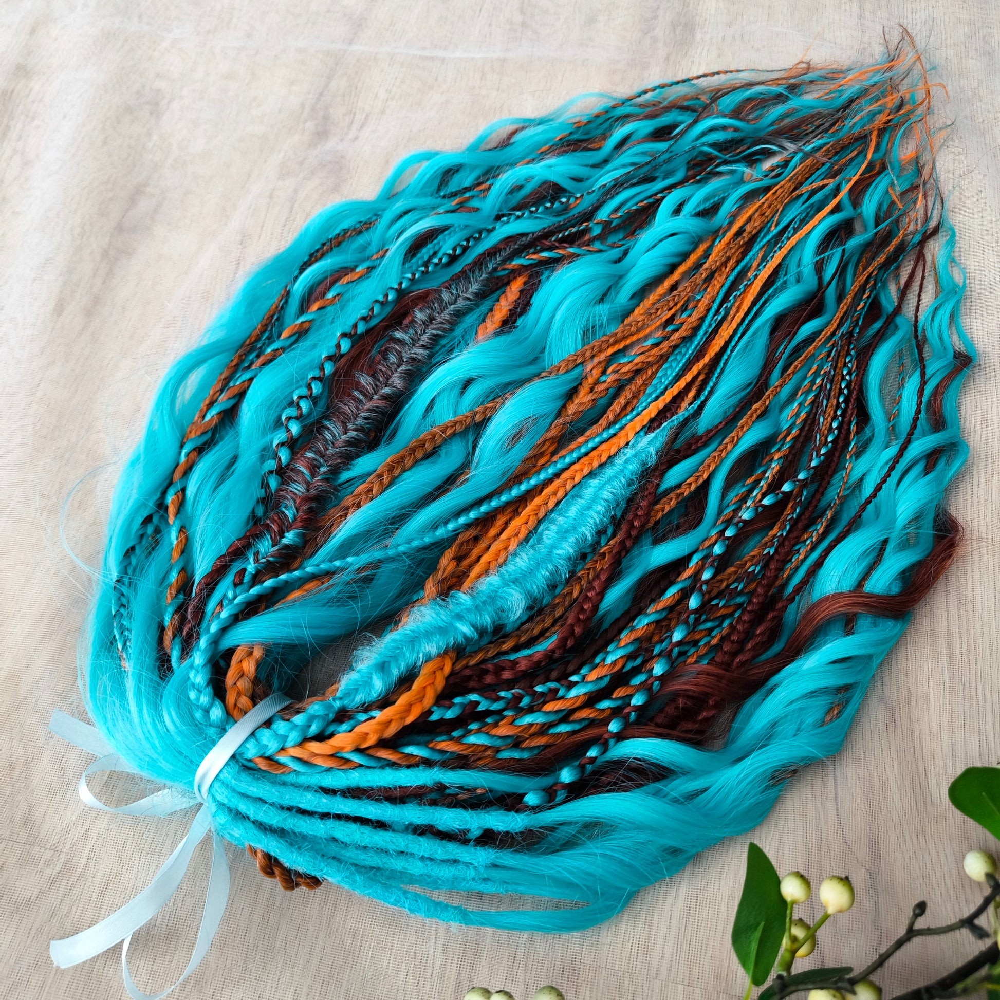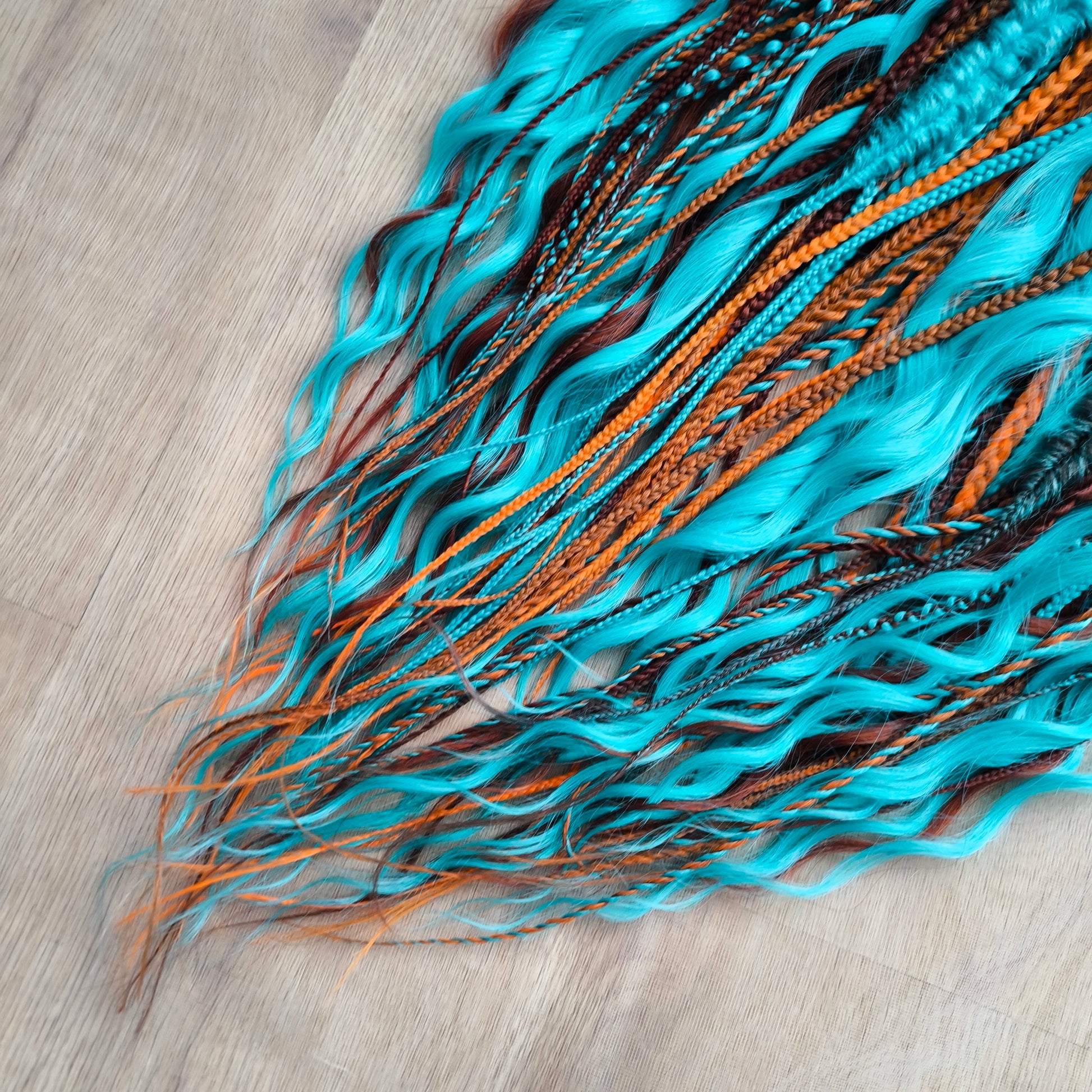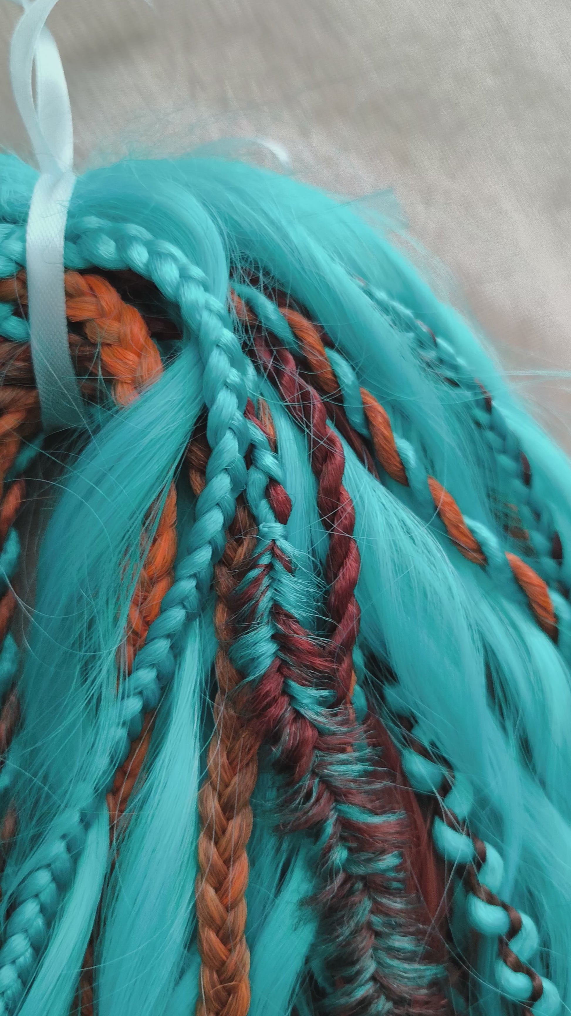 Ready to ship: Ginger Sky 60 DE synthetic regular dreaded brushable curls and braids; mix of red and turquoise