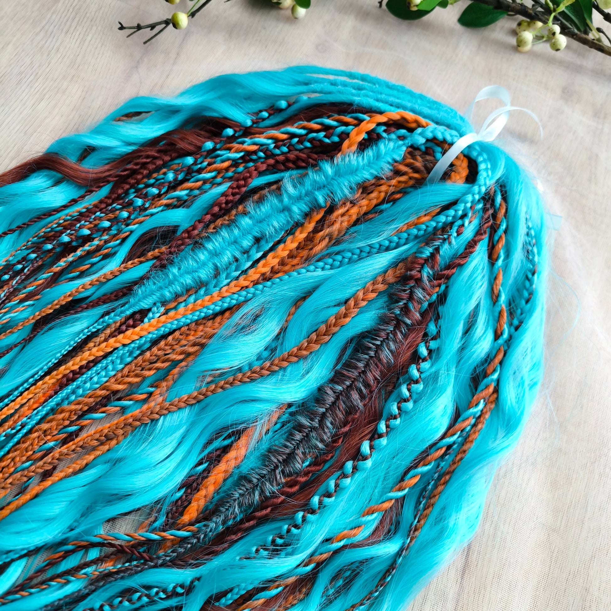 Ginger Sky: soft, lightweight, and reusable 60 double ended synthetic braids and regular dreaded brushable curls. A mix of turquoise green, red, and orange colours.