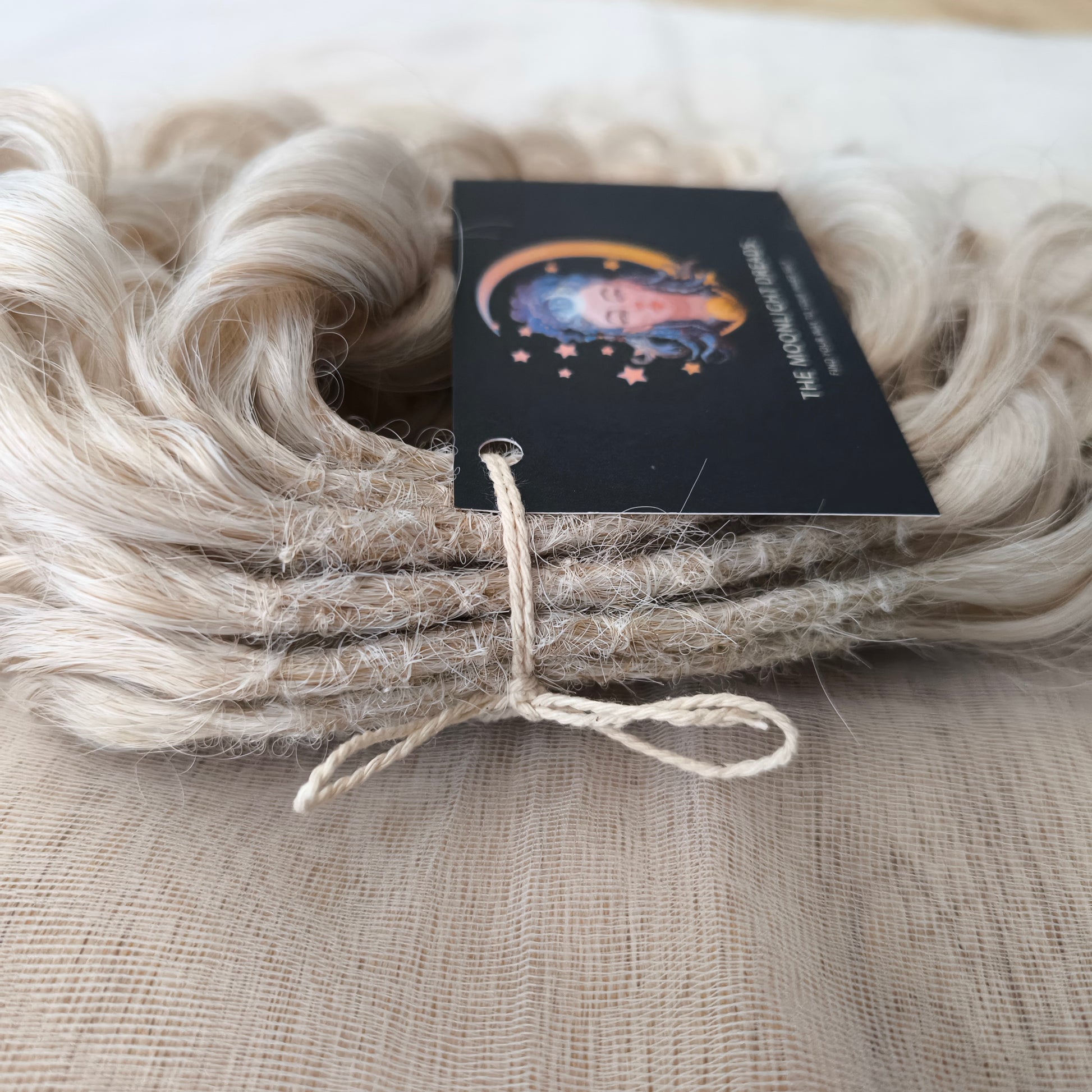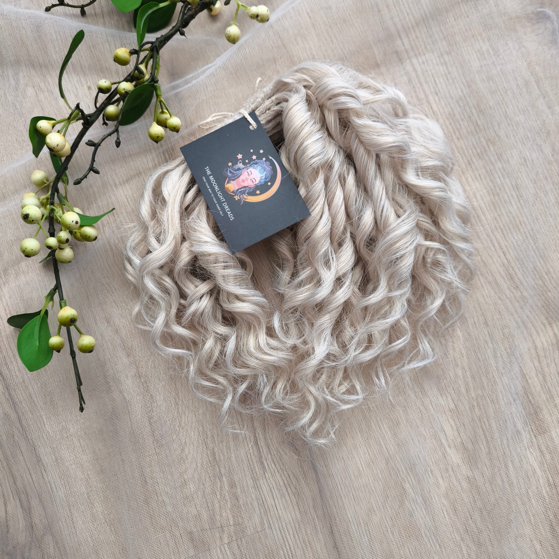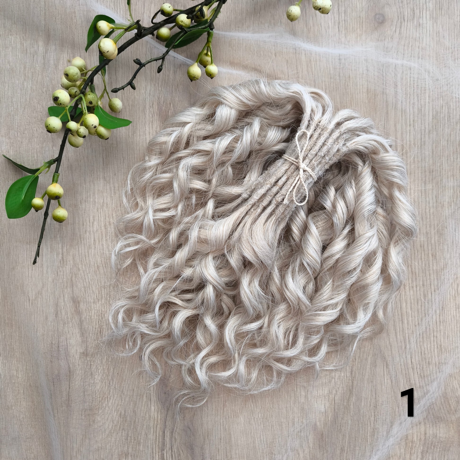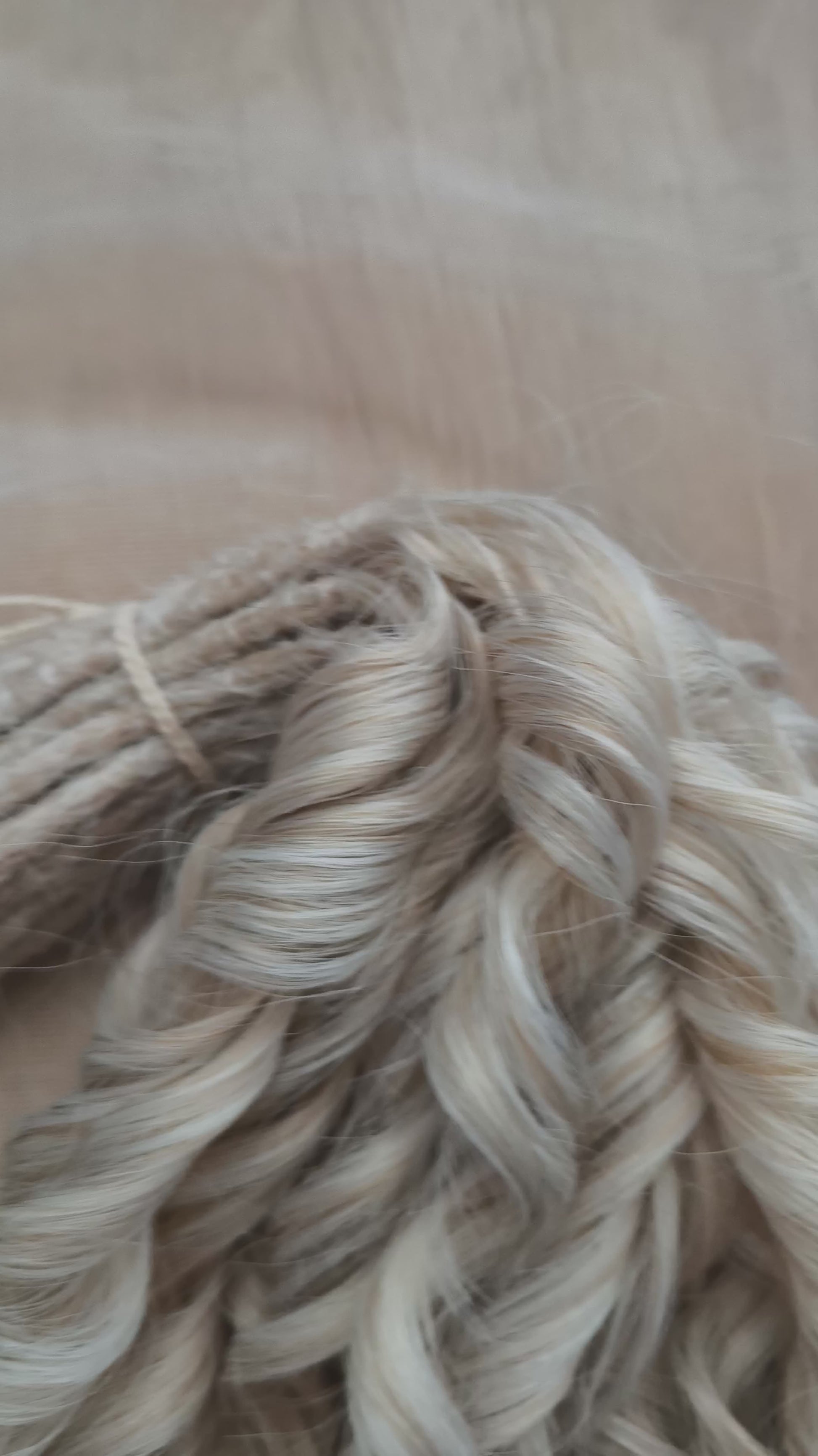 Natural-looking short Jessica regular dreaded curls are available in a few shades of platinum blonde (solid and ombre) and silver colors. The length is 10 inches (25 cm), dreaded part ±3-4 inches. If you need a longer or shorter dreaded part, contact me before ordering