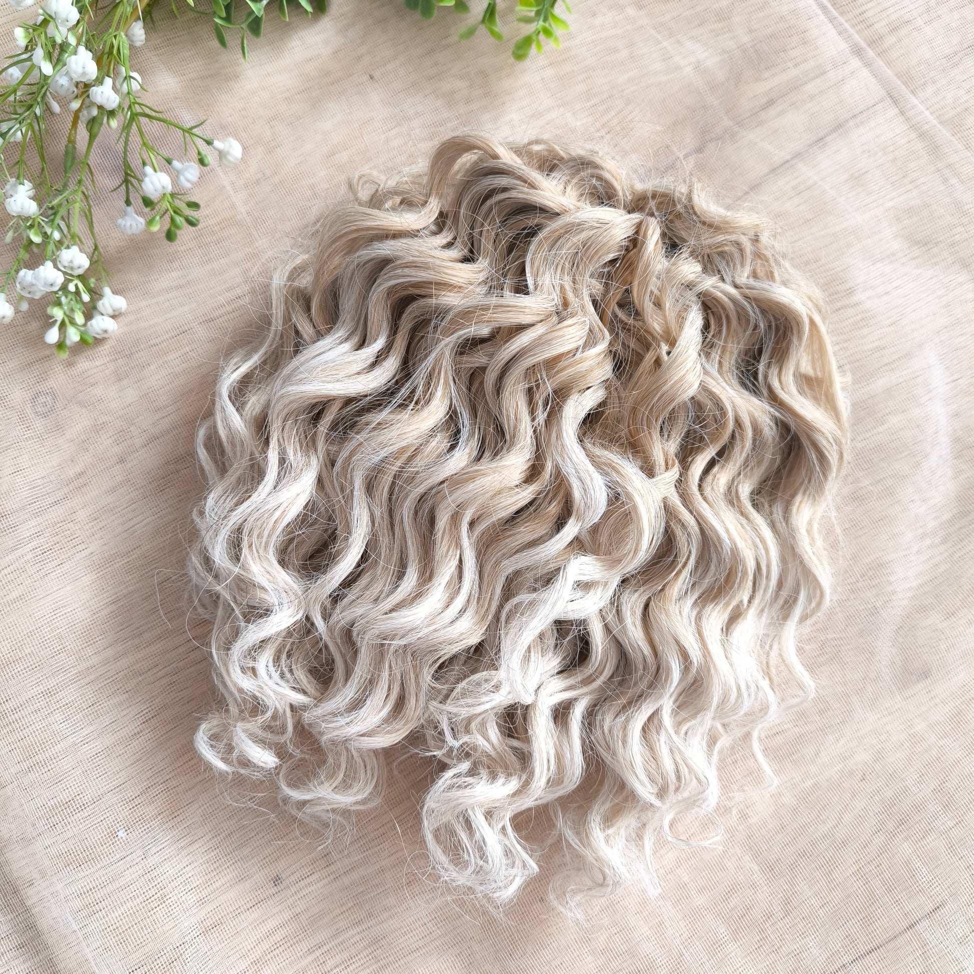 Natural-looking short Jessica regular dreaded curls are available in a few shades of platinum blonde (solid and ombre) and silver colors. The length is 10 inches (25 cm), dreaded part ±3-4 inches. If you need a longer or shorter dreaded part, contact me before ordering